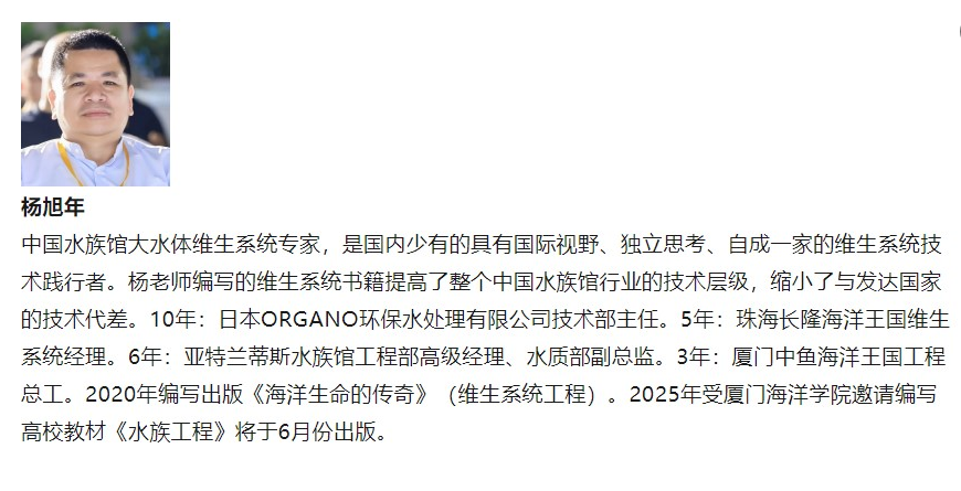 我司總工楊旭年先生接受亞州水族技術(shù)研究院的邀請,在2025年4月15至18日出席在貴陽舉辦的第六國際水族館交流培訓(xùn)會,任《海洋館維生系統(tǒng)設(shè)計(jì)》課程講師,課程主要內(nèi)容包括: